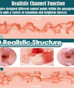 - Our product is made of elastic materials and features a 3D realistic design with a textured structure that tightly wraps around your intimate area, making the realistic sex doll suitable for any size of penis. If you insert into a moist vagina, you will have a feeling similar to real insertion, with soft circular texture similar to real flesh, and protruding meat strips massaging the penis. We use channels with spiral narrow stripes and ultra tight particles to ensure a more stimulating experience with each insertion.
