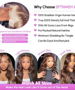 - 【Chocolate Brown Lace Front Wig Material】13×6 Lace Front Wigs Human Hair is Unprocessed Brazilian Virgin Human Hair Lace Front Wigs. 200 Density HD Lace Front Wigs Human Hair, Full and Thick. 100% Unprocessed Brazilian Virgin Human Hair. Soft and Natural, Healthy and Vibrant, No Dry End, Zero Split Ends, Comfortable Against Skin