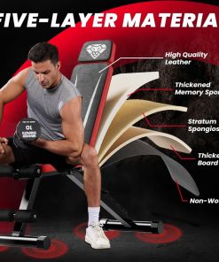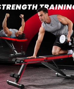 - Adjustable Weight Bench – This adjustable workout bench has 9 back adjustments from 95°-215°. Foldable bench can accommodate a variety of exercise postures. Equipped with resistance bands that also help you with your pre-workout warm-up