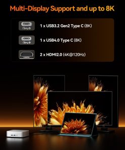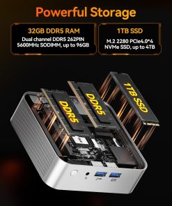 - [Blazing-Fast Memory and Storage] The A8 mini desktop comes with 32GB of RAM and supports dual-channel DDR5 5600MT/s SODIMM expansion up to 96GB for seamless multitasking. For storage, it includes a 1TB M.2 2280 NVMe Gen4*4 SSD (expandable up to 4TB), fully compatible with Gen3 SSD, ensuring fast data read and write speeds.