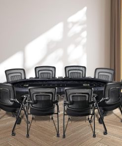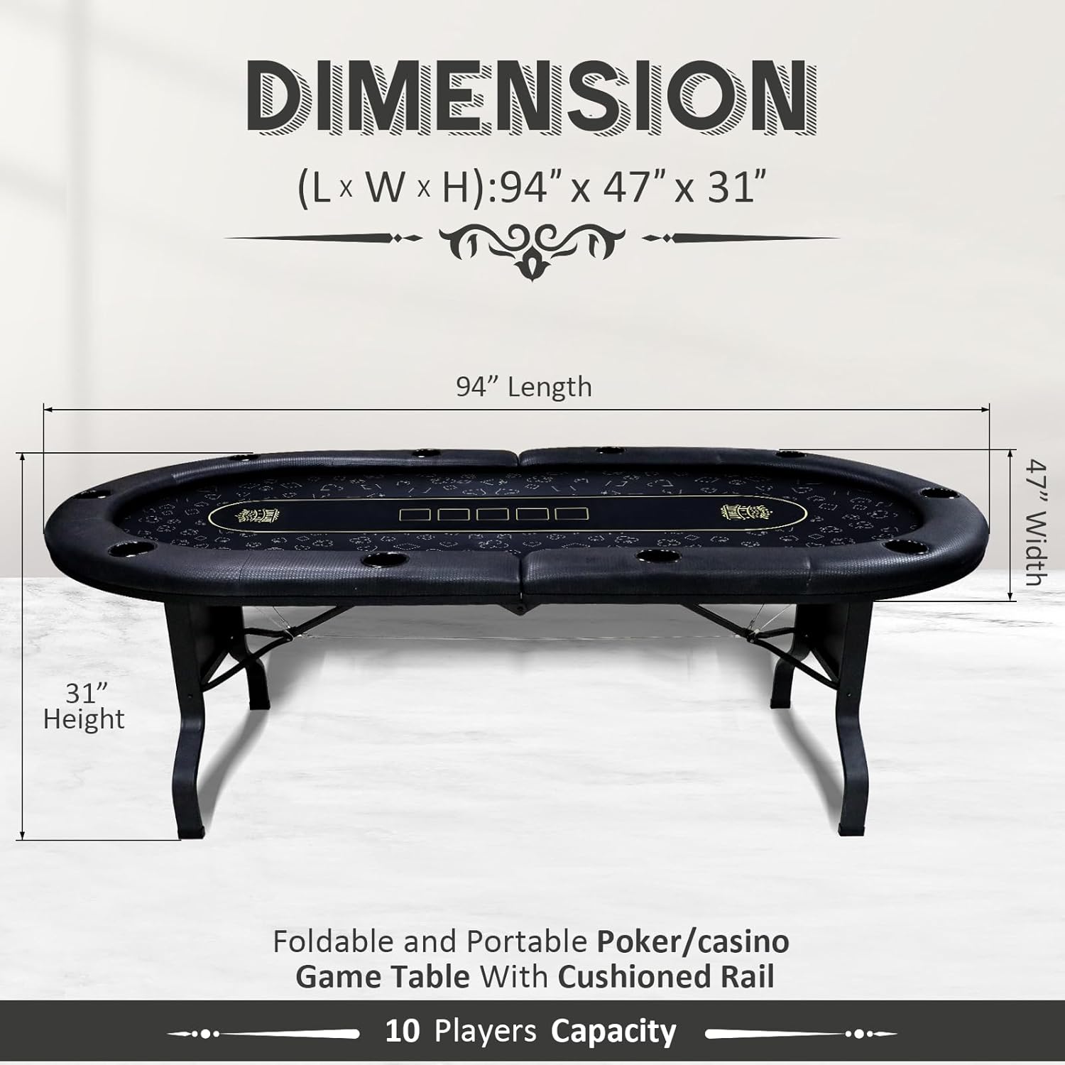 - 𝗖𝗼𝗺𝗳𝗼𝗿𝘁𝗮𝗯𝗹𝗲 𝗦𝗲𝗮𝘁𝗶𝗻𝗴 & 𝗘𝘅𝘁𝗿𝗮 𝗠𝗮𝘁 𝗜𝗻𝗰𝗹𝘂𝗱𝗲𝗱: Comes with 10 premium folding chairs that match the table’s professional appeal, offering both comfort and durability for every player. The included extra poker table mat provides enhanced portability and protection, allowing you to set up your game anywhere on any surface with ease.