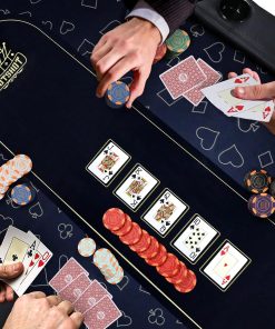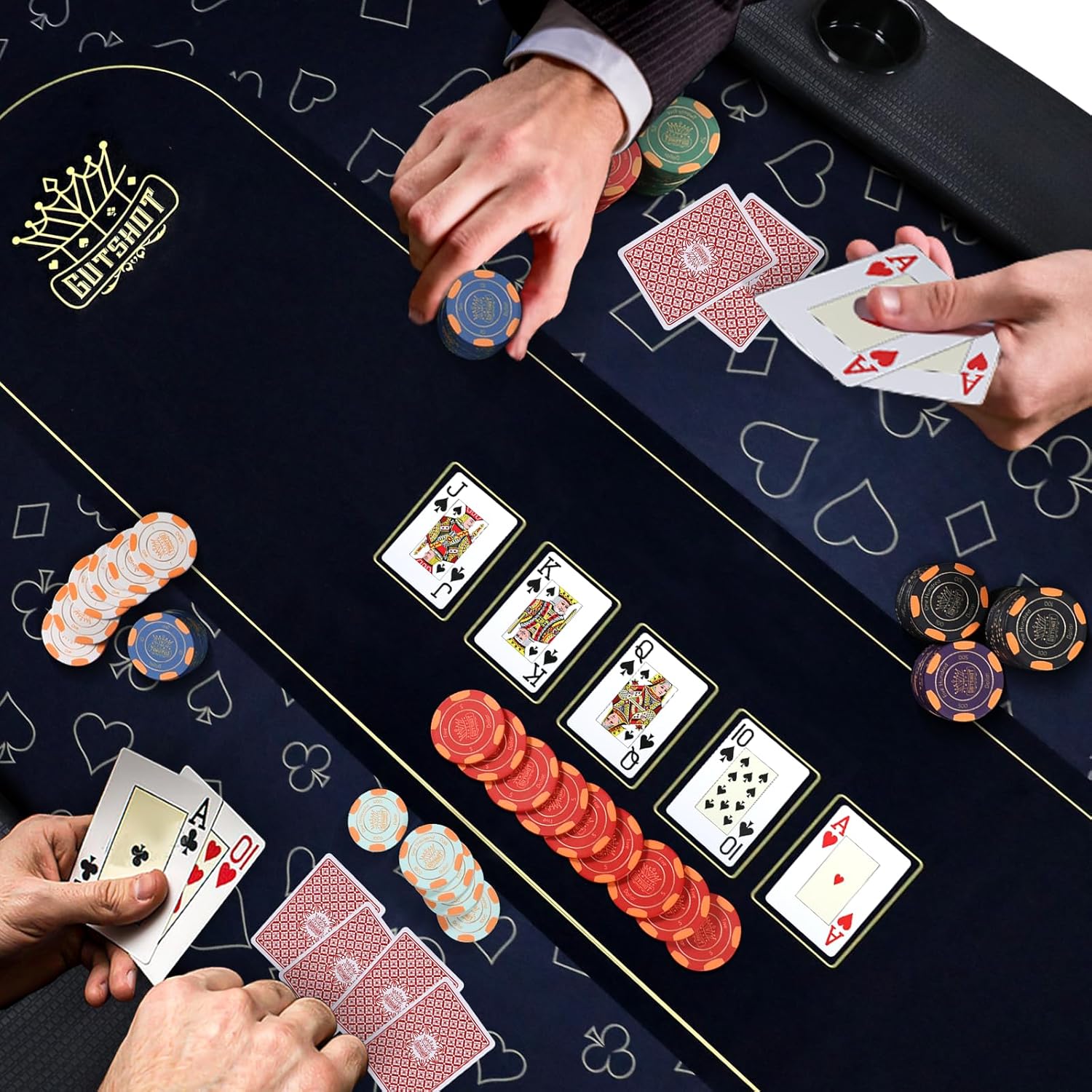 - 𝗤𝘂𝗶𝗰𝗸 & 𝗘𝗮𝘀𝘆 𝗦𝗲𝘁𝘂𝗽: The Gutshot 10 Player Foldable Poker Table with 10 chairs and 1 extra mat features an innovative design that allows you to set up in under 30 seconds, making it the ideal folding game table for any game night. Enjoy a seamless experience with minimal effort.