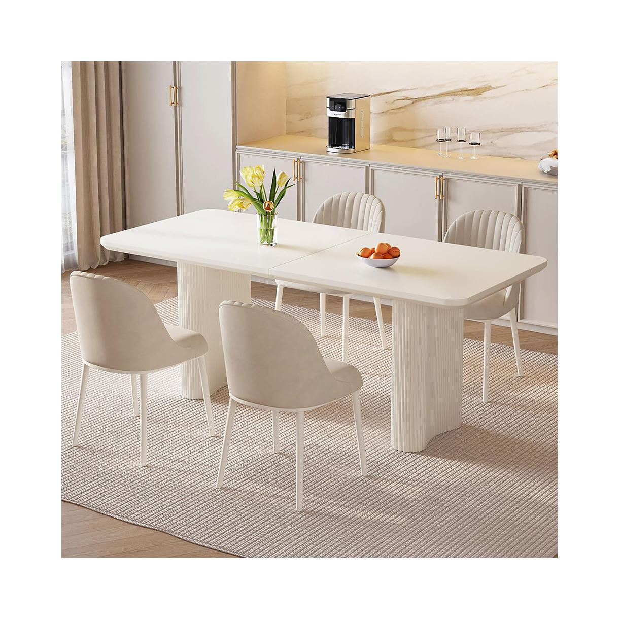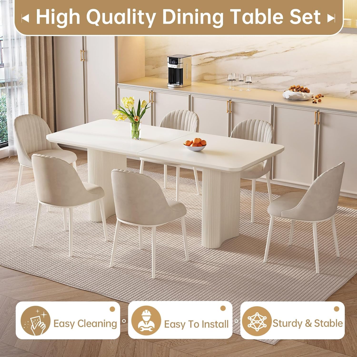 Kitchen Set with 4 Chairs for 4-8 People,Dining Room Table Set Kitchen Table Furniture with Upholstered PU Chairs,Stable Frame Dining Table,Cream White