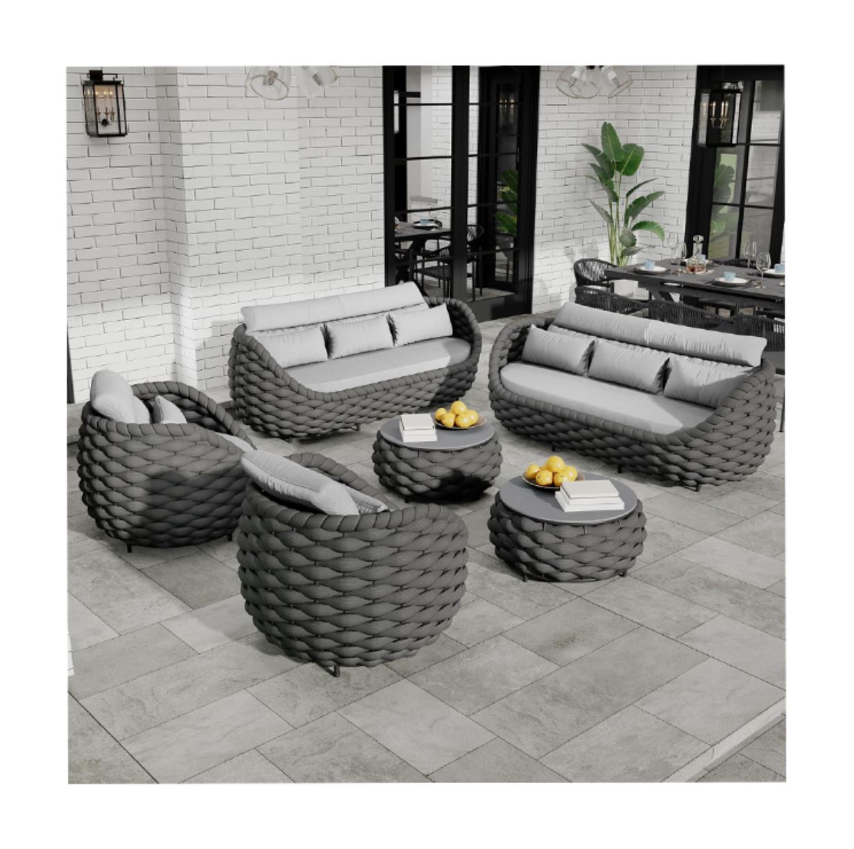 - Inspired by bird’s nest shape, the Erotr assembled cushioned lounge set for 8 person combines comfort, elegance and durability. Knitted-like ropes give a warm comfy looking. Curved scoop armrest, supportive backrest and deep cushioning offer an enveloping ultimate relaxation