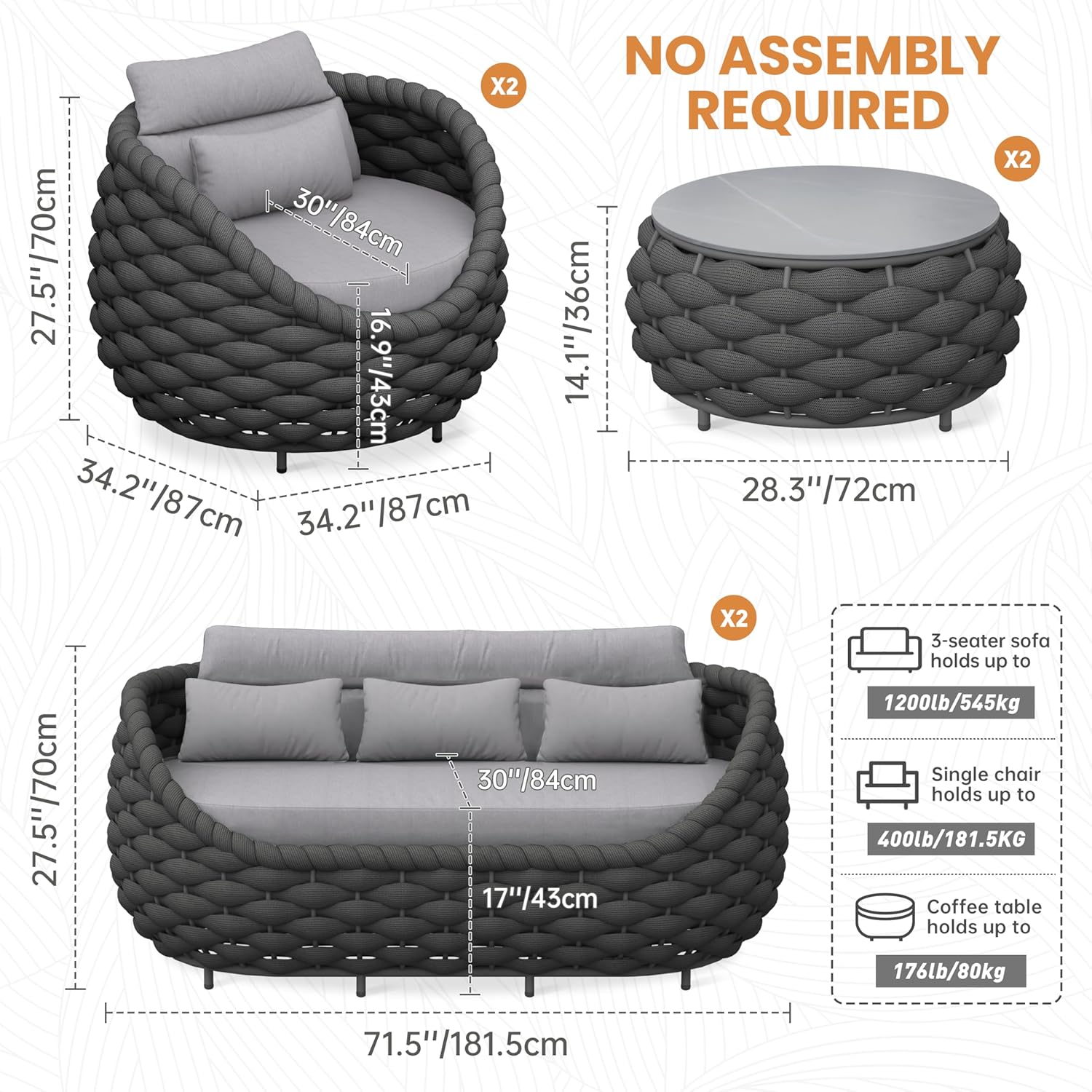 - Woven rope sofa set includes: 2*armchairs, 2*3-seater sofas, 2*coffee tables. Size: Single chair: 34.3”(L)X34.3”(W)X27.6”(H) holds up to 400 lbs/181.5kg; 3-seater couch: 71.5”(L)X34.7”(W)X27.6”(H) holds up to 1200lbs/545kg; Side table: 28.4”(L)X28.4”(W)X14.2”(H) holds up to 176 lbs/80kg. Color: Dark gray rope and gray fabric