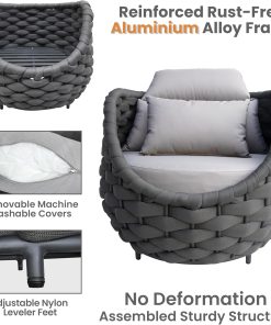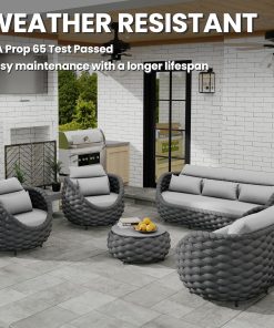 - Furniture set is crafted from reinforced rust-free aluminum alloy frame, wrapped in hand woven polyester rope. The 6 pieces all weather patio upholstered conversation set resists to UV, rain, wind, salt water. Perfect for indoor outdoor even arid or coastal areas