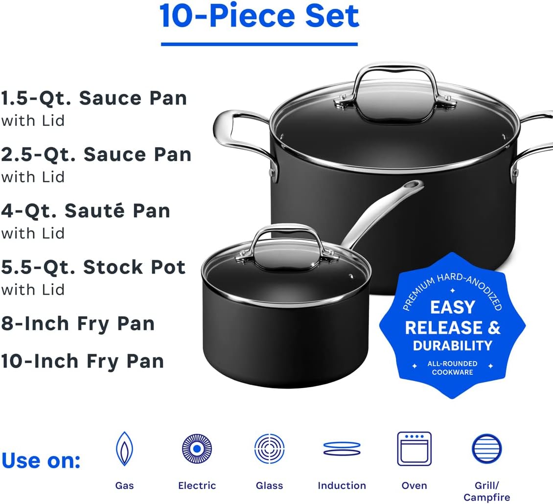 - 10 PIECE 3 PLY SET INCLUDES EVERYTHING YOU NEED. This set includes: 5.5qt stock pot, 4-qt. saute pan, 2.5qt & 1.5qt sauce pans, 10″ & 8″ fry pans, and 4 lids that fit all pieces. Strainer lids are not available at this time. Use the same frying pan to make pancakes and eggs for breakfast and the perfect Swiss steak for dinner. The versatile Dutch oven lets you make cooktop pot roast one night, and then oven-braised beef stew the next day. Works with all electronic cooker appliances.