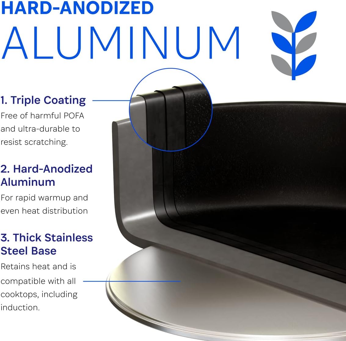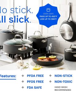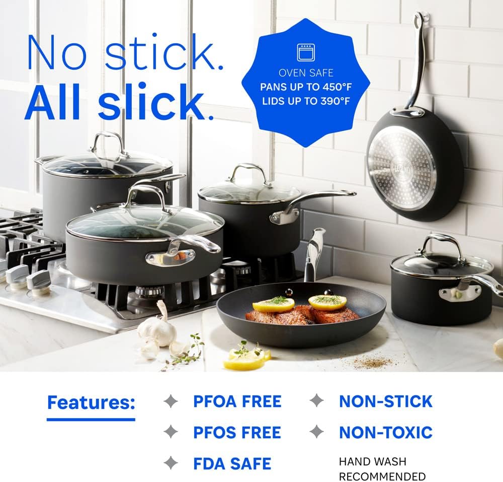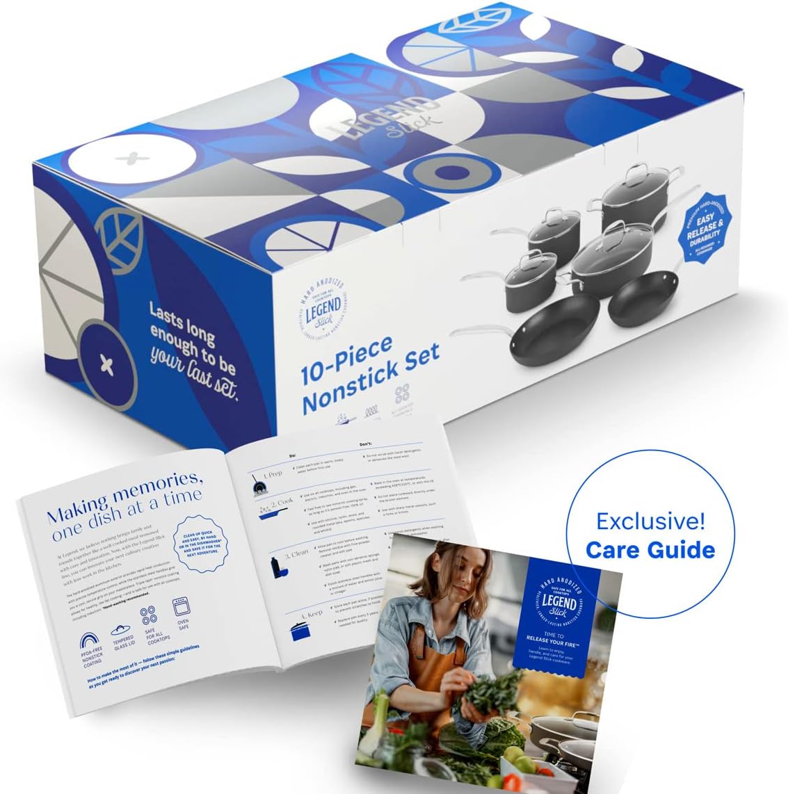 - COOK CLEANLY WITH NEXT GEN NON-STICK. The Slick Hard Anodized Non-Stick Cookware Set from Legend Cookware is constructed from high quality materials, making these pots and pans the perfect essential kitchen workhorses. The hard anodizing process creates a safe nonstick cooking surface. The multi-ply aluminum layers heat up quickly and evenly and retain heat throughout use. Each piece is finished with a durable stainless steel base. Heavy duty, but lightweight compared to cast iron.